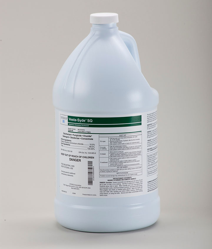 STERIS' Vesta-Syde® SQ Quaternary Ammonium Disinfectant is the non-sterile version of the Vesta-Syde SQ family of disinfectants made specifically for use on hard non-porous surfaces. The Vesta-Syde SQ products are all made with the same quaternary ammonium formulation, but are processed and packed differently for specific applications. At a use-dilution rate of 0.8% v/v (1:128), the Vesta-Syde SQ products kill a broad spectrum of common bacteria and fungi without harming the surface.